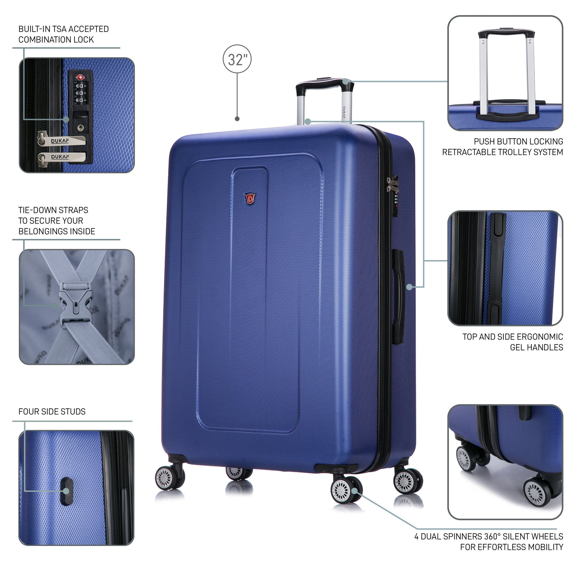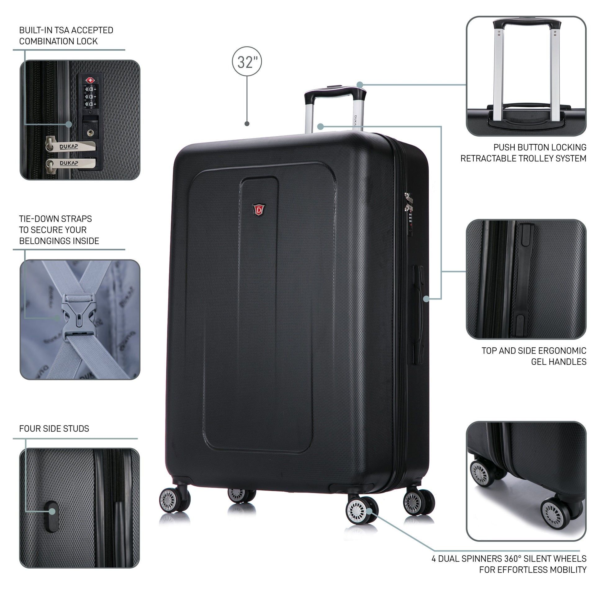 The lightweight 32-inch Crypto hardside spinner is an extra-large, durable, and water-resistant travel accessory. It features a retractable trolley system, four silent spinner wheels,... and a fully equipped interior panel with zippered compartments for easy packing. DUKAP develops and produces products under the most rigorous stress tests, simulating real-life scenarios to maximize the durability of each component and create the perfect suitcase. Knowing your suitcase has all the features you need and a stylish look will enhance your travel experience. DUKAP is more than a suitcase; it's a lifestyle.