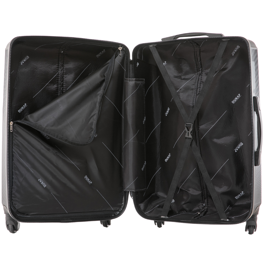 The Dukap Discovery Hardside Spinner 3-Piece Luggage Set includes 20", 24", and 28" suitcases. Each piece features four dual spinner wheels,... a fully lined interior, ergonomic gel handles, side studs for stability, a retractable trolley system, and oversized zippers.