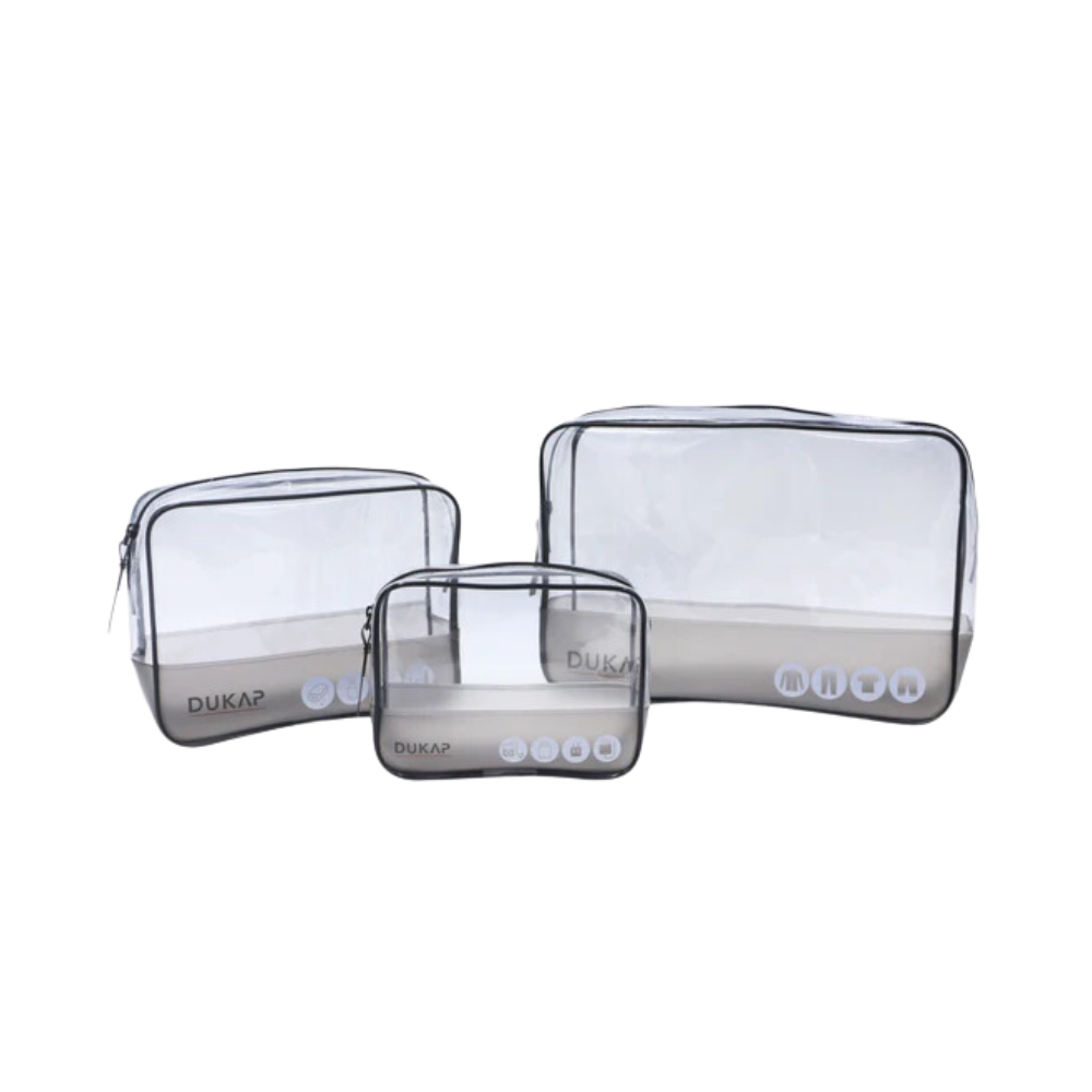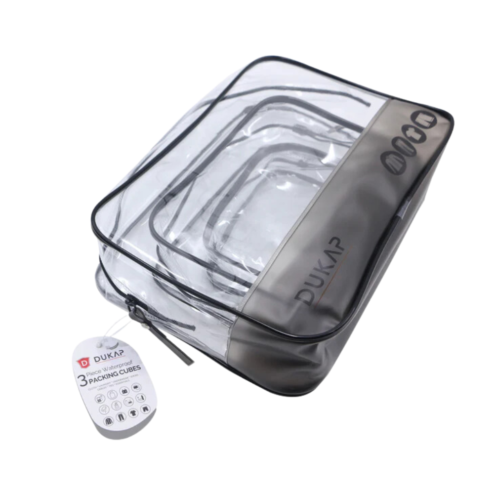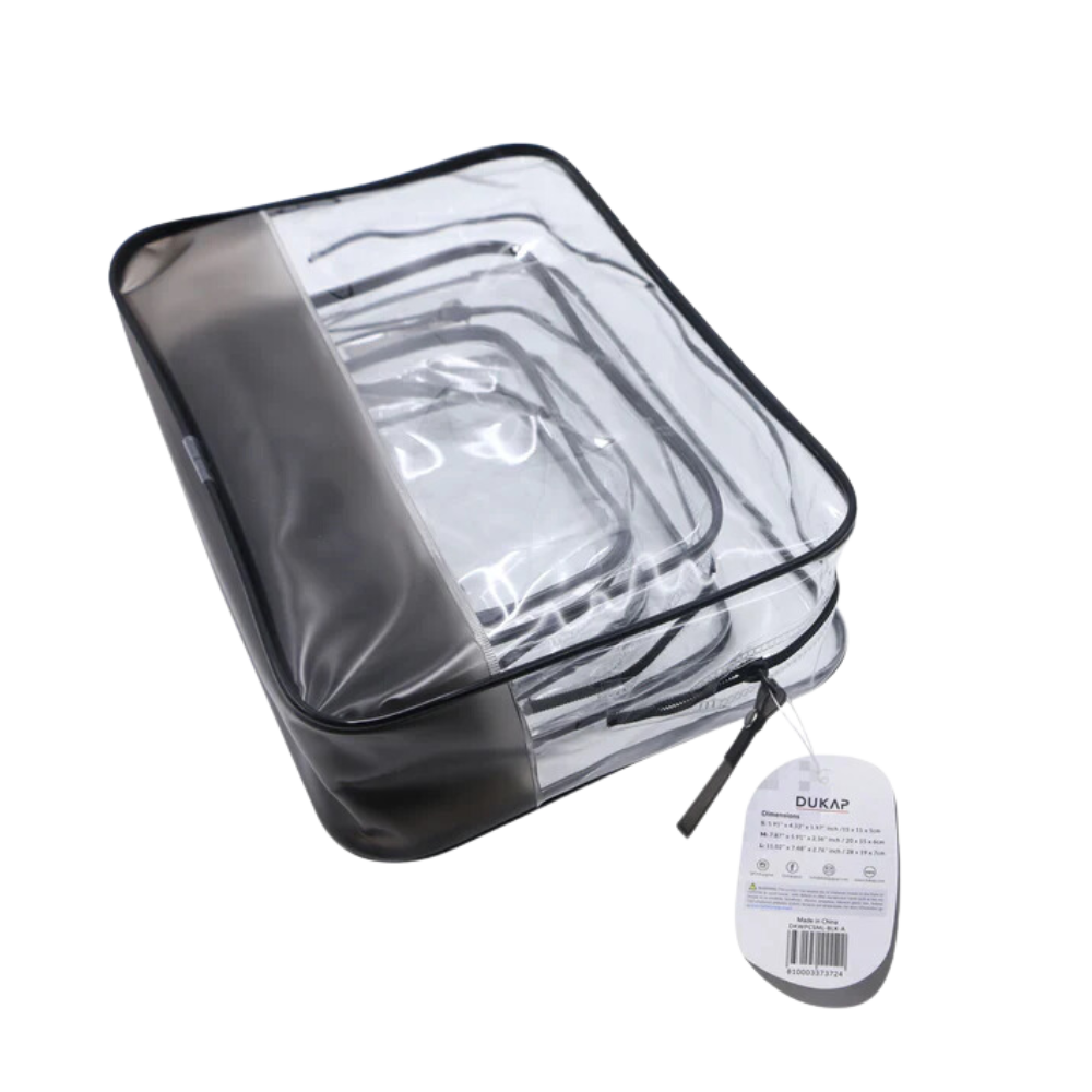 Introducing the Dukap Clear Waterproof Packing Cubes - your ultimate travel companion! Stay organized on short or long trips with these waterproof and leak-resistant cubes. TSA-approved and perfect for storing essentials, clothes, makeup, and more. Pack, unpack, and breeze through security hassle-free. Your stress-free travel starts now!... At DUKAP we develop products under the most rigorous stress tests, our 3 pieces clear PVC packing cubes traveling set allows you to organize your clothes, toiletries, cables, accessories, essentials, and more. They are TSA approved and the small and medium size bag follow the 3-1-1 liquid rule making it easy to pass through airport security. They are highly durable, easy to clean, waterproof, and leak resistant making them perfect for work trips or leisure vacations.