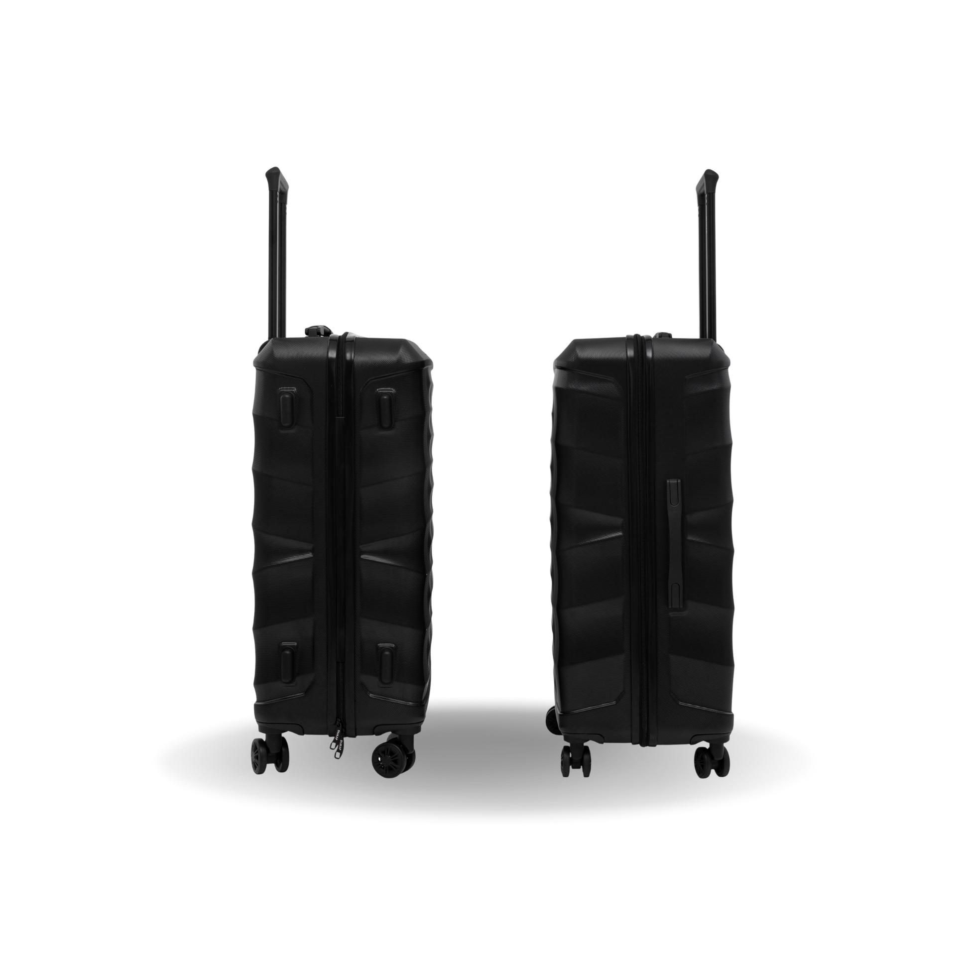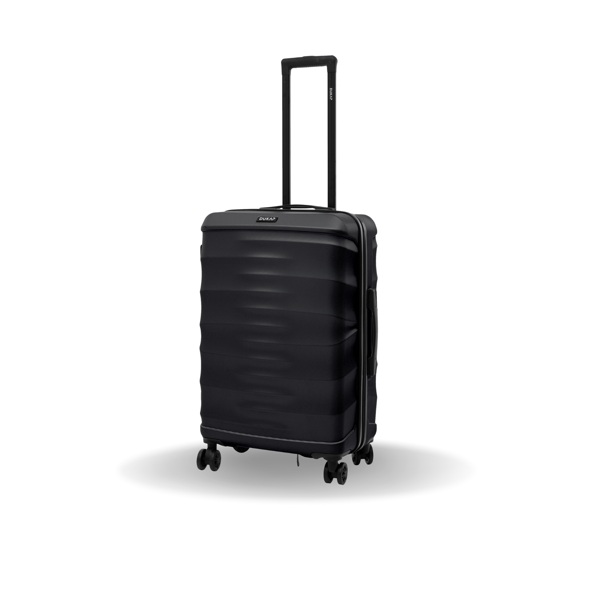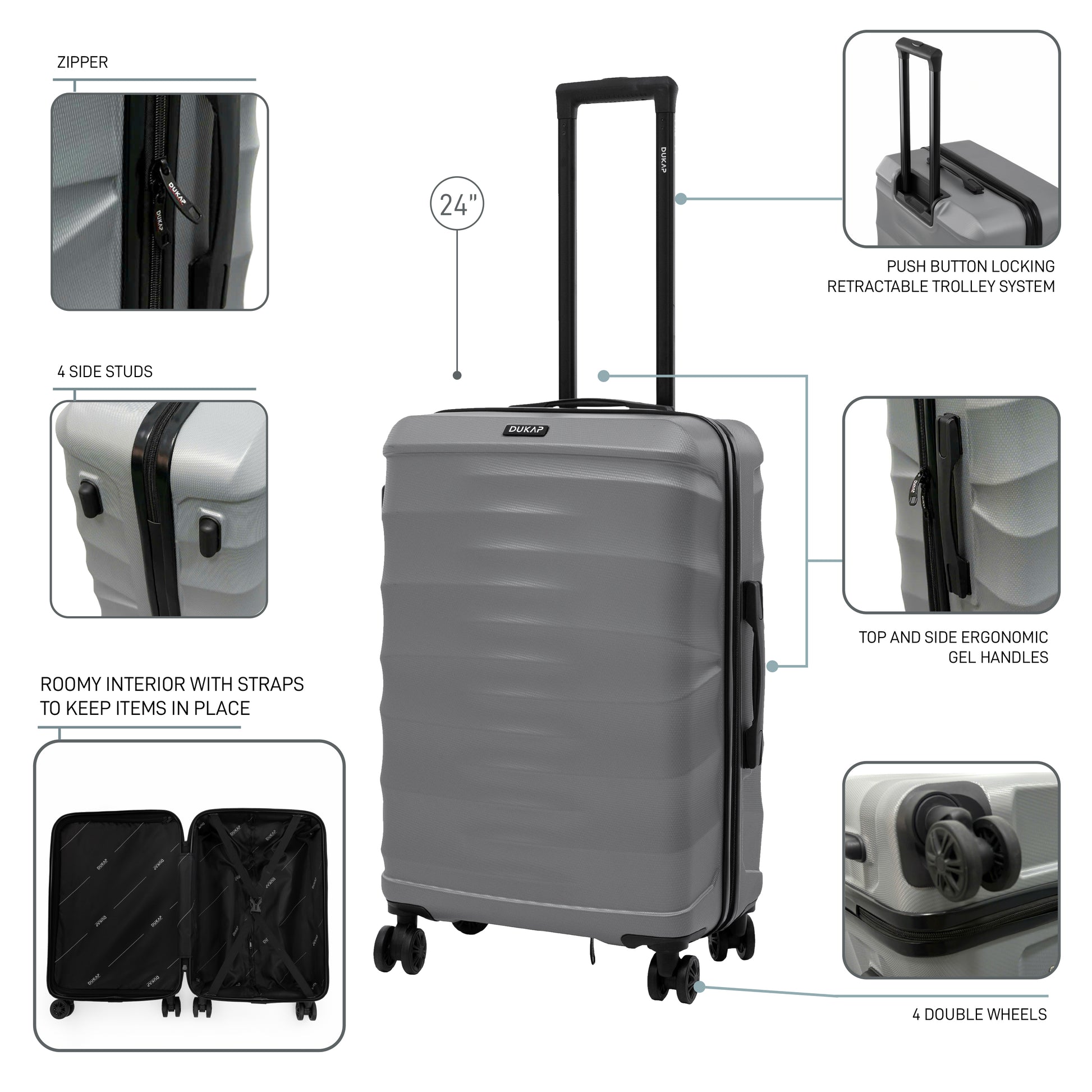 Travel easier and more efficiently with the DUKAP RAV 24-inch Check-In Luggage, which was designed with durability, style, and functionality all in one compact package.... The hardside luggage itself is composed of PC/ABS hard-flex material with a micro-diamond finish that is lightweight, scratch-resistant, water-resistant, and resistant to impact; your belongings will be secure and protected during every journey. The hard shell suitcase is superior to soft bags in that it is built to last a long time, while still looking sleek and modern as it fulfills its purpose. The check-in luggage glides across airports, train stations, and city streets with ease, while being designed for maximum maneuverability. The four dual spinner 360° silent wheels support a push-button retractable trolley system with gel handles that allow you to travel smoothly and comfortably. The checked baggage is designed to travel comfortably with you, cross-country or internationally. Inside the suitcase, you can pack exceptionally well. The fully lined inside features a zippered divider compartment for small things, and elastic cross straps to secure clothes and other necessities.. This intelligent design maximizes space, prevents wrinkles, and ensures stress-free packing. With a spacious capacity and smart dimensions, the DUKAP RAV check-in suitcase meets most airline requirements for checked luggage, making it ideal for long trips, vacations, and business travel.